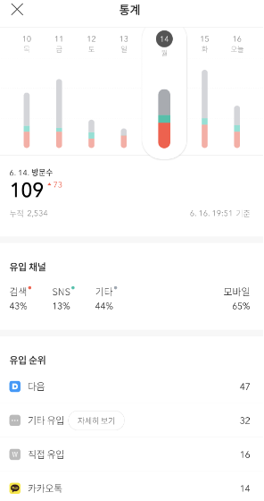 현재 제가 포스팅을 하고 활동하는 날이면 100명 내외로 방문자가 있습니다. 6월 14일에는 다음 검색으로 47명이 방문하셨고, 방문자분들이 카카오톡으로도 공유를 해주셨습니다. 토요일, 일요일을 보시면 제가 개인적인 이유로 블로그를 못해도 꾸준히 검색과 SNS로 유입이 되고 있었습니다.(물론 아주 조금이지만 ㅎㅎ). 이렇게 하루하루 방문하시는 분들이 많아지는 것을 보면서 꾸준하게 포스팅을 진행했습니다.