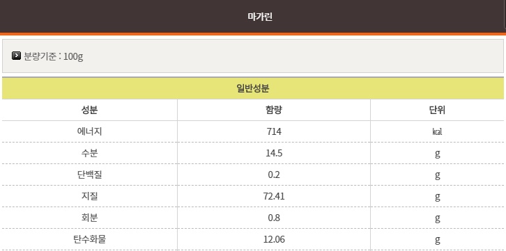 인조버터라고도 불리며 식물성 기름으로 제조된다. 식물성 기름을 사용하여 예전에는 트랜스 지방 함량이 매우 높았고, 버터보다 건강에 좋지 않다는 인식이 많았다. 하지만 지금은 트랜스 지방이 없는 마가린이 개발되어 판매되고 있으며, 비타민 A, D와 리놀레산을 넣은 제품도 개발되어 버터보다 건강에 좋다는 인식으로 변하고 있다. 아래 농식품 올바로에서 제공하는 마가린 성분표를 확인해보자.